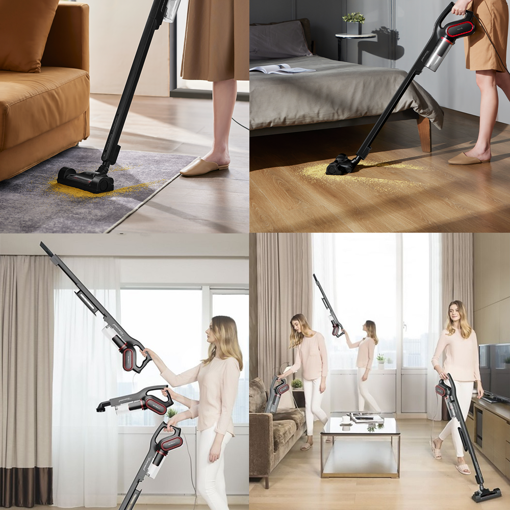 Multifuncional 2 en 1: úsala de pie o de mano según la tarea. Perfecta para limpiar desde pisos y alfombras hasta cortinas y muebles.