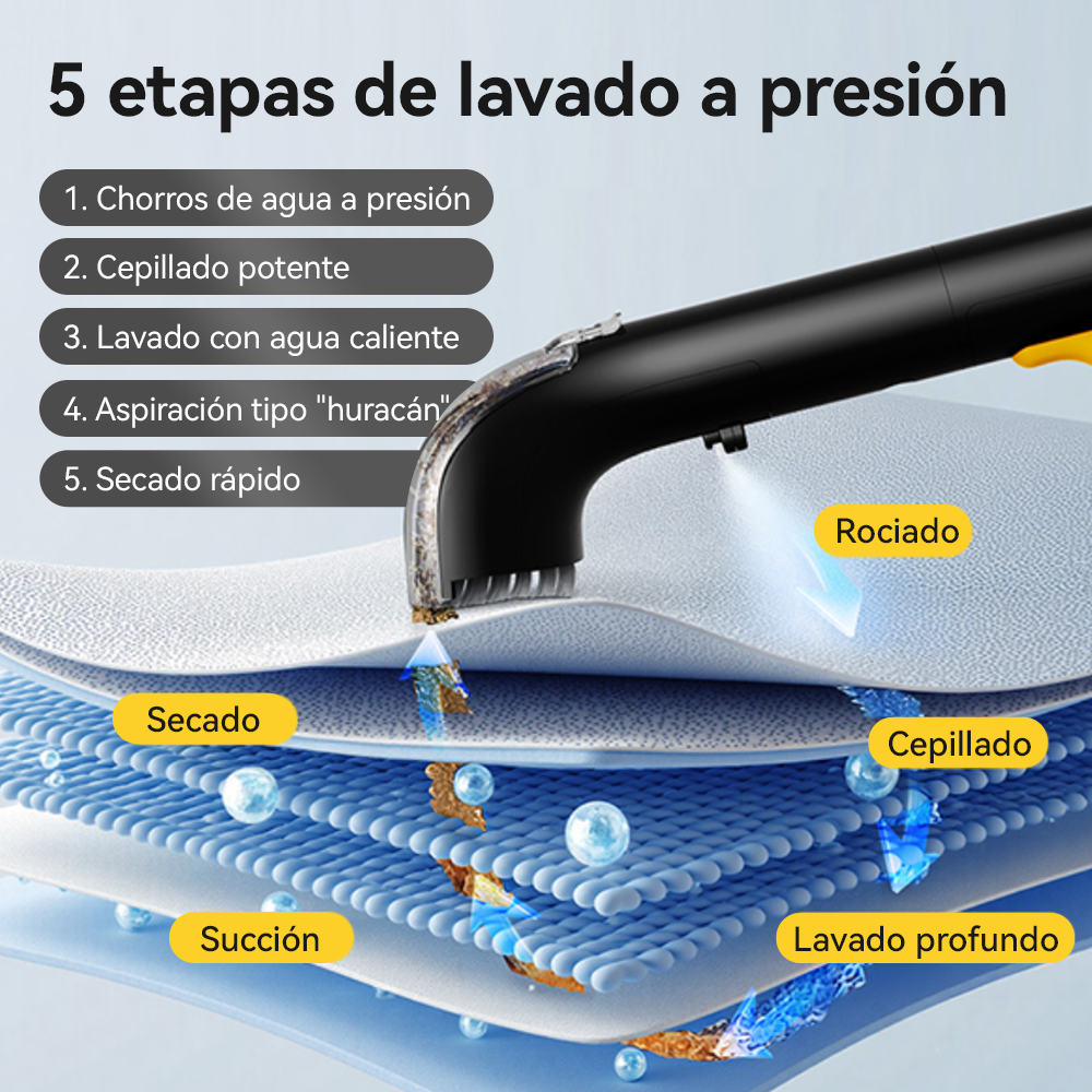 - Limpieza Profunda 5X: Boquilla de chorro de alta presión con 5 salidas que impulsan el agua profundamente, combinada con cerdas ultradensas para deshacer manchas al instante.