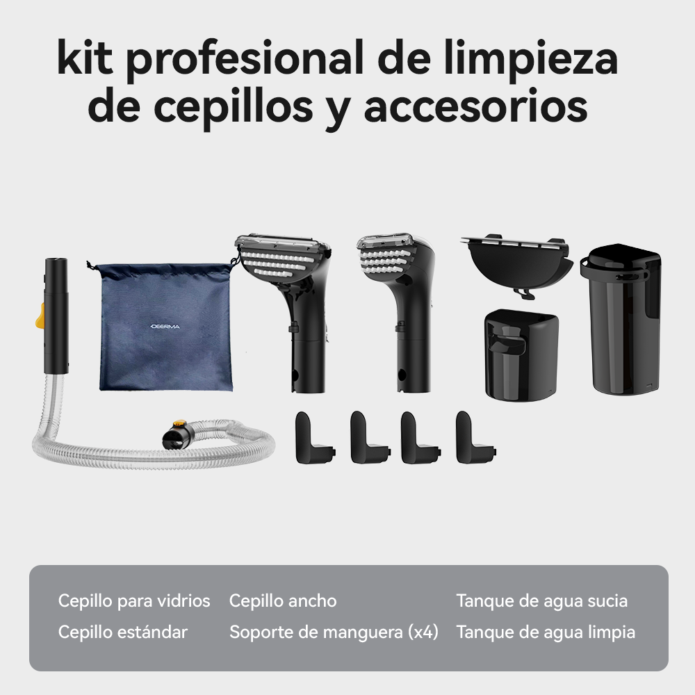 Este equipo cuenta con 3 cabezales especializados para más de 15 escenarios de limpieza. Incluye un cepillo estándar para sofás y cojines, un cepillo de abanico ancho que aumenta la eficiencia en un 70% para alfombras o cortinas, y un cepillo para vidrios (accesorio raspador) para espejos y mármol. Además, incluye 4 soportes para manguera, bolsa de almacenamiento y manual de usuario.