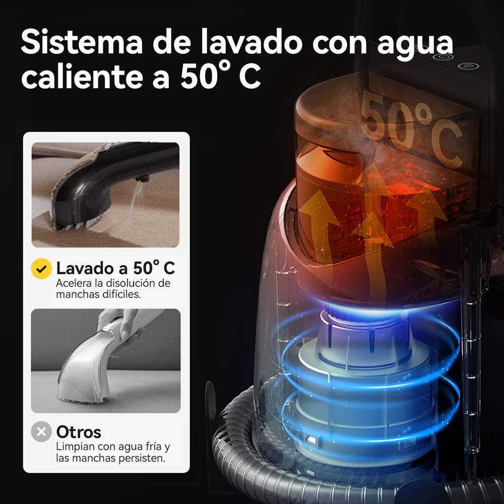 A diferencia de las aspiradoras convencionales, este equipo inyecta agua a presión y succiona simultáneamente. La función de agua caliente a 50°C (sistema PTC) permite disolver grasas, aceites y microorganismos con mayor rapidez, dejando tus superficies no solo limpias, sino también higienizadas. Con su potente motor de 1200W y una fuerza de succión de 13 kPa, lograrás resultados de limpieza profunda sin necesidad de desmontar las telas.
